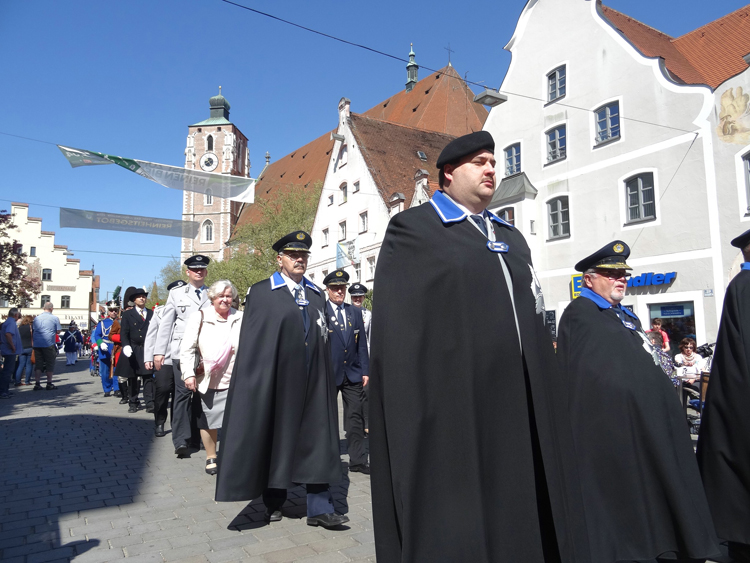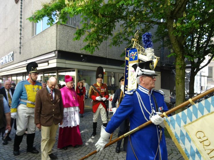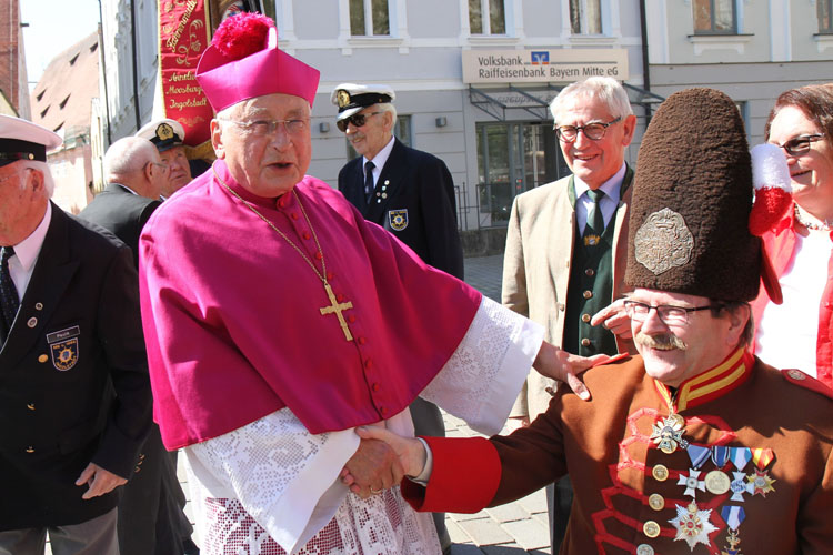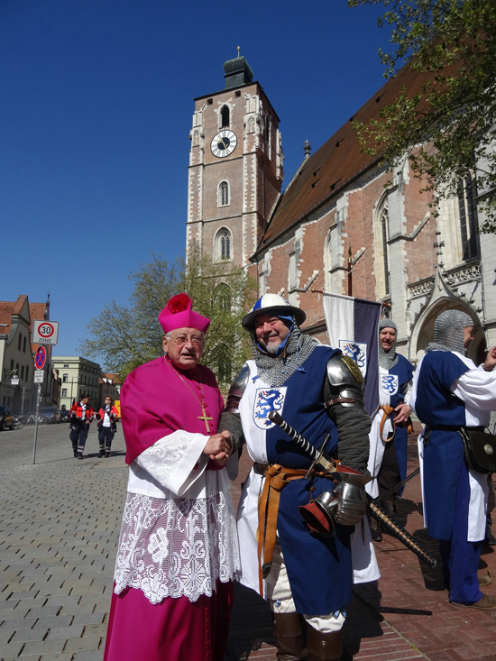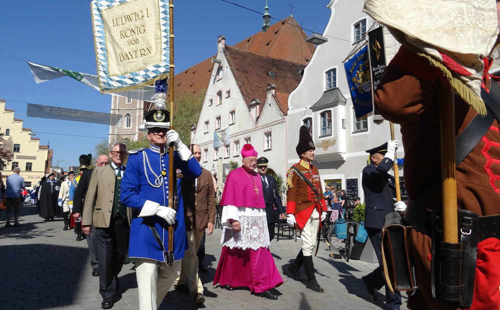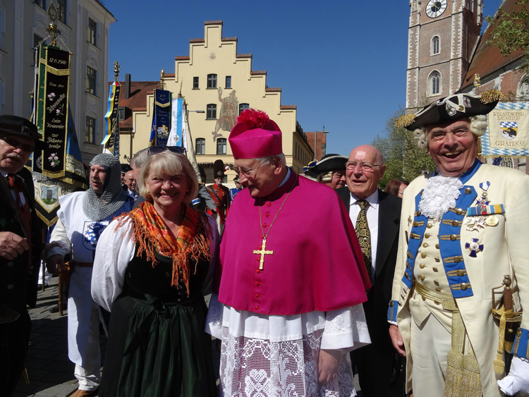 Bei sonnigen Wetter bewegte sich der Festzug vom Liebfrauenmünster zur Moritzkirche. Angeführt wurde dieser farbenprächtige Zug von der Blaskapelle Hitzhofen. Seine Königliche Hoheit Wolfgang Prinz von Bayern, S.E. Bischof Dr. Walter Mixa und die Ehrengäste Dr. Ernst Aichner, Museumsdirektor i.R., MdL a.D. Manfred Dumann, Vorsitzender der Freund des Bay. Armeemuseum und der Präsident der Bayerischen Kameraden- und Soldatenvereinigung Hans Schiener aus Plößberg zogen mit klingendem Spiel zusammen mit den Abordnungen der Mitgliedsvereine aus ganz Bayern, den teilnehmenden Gruppen der Bayerischen Kameradschaft und Soldatenvereinigung und den erstmals teilnehmenden Rittern der Deutschen Ehrenlegion, die Stadtwache Ingolstadt und die Marinekameradschaft Ingolstadt durch die Fußgängerzone in die Moritzkirche. Die sehr würdevolle Festmesse, wurde von der Blaskapelle Hitzhofen feierlich umrahmt. Den Ehrensalut schoss die Historische Bayerische Schützen Compagnie der Stadt Waldmünchen. Mit der Kranzniederlegung durch S.K.H. Wolfgang Prinz von Bayern aus München, den Landeskommandanten der Bayerischen Bürger- und Landwehren in Bayern Oberst d.Ldw. Jürgen Völkl aus Störnstein und den Präsidenten der Bayerischen Kameraden und Soldatenvereinigung Präsident Hans Schiener aus Plößberg gedachten die Teilnehmer den verstorbenen Kameraden und Angehörigen. Die Ehrenwache und die Kranzträger wurden von der Historisch Königlich Bayeri-schen Bürgerwehr Neustadt a.d. Waldnaab gestellt. Zum Schluss der Feierlichkeiten Erklang die Bayernhymne und die Nationalhymne. Nach dem Gottesdienst begaben sich alle Teilnehmer ins Hotel, Gasthof „Zum Anker“ zum gemeinsamen Mittagessen. S.K.H. Wolfgang Prinz von Bayern dankte in seiner Ansprache allen Teilnehmern für die große Teilnahme. Sein besonderer Dank galt dem emeritierten Bischof Dr. Walter Mixa für den würdevollen Festgottesdienst. Landeskommandant Oberst Jürgen Völkl bedankte sich bei den teilegenommenen Gruppen und den Mitorganisationen der Veranstaltung Herrn Museumsdirektor a.D. Dr. Aichner und den MdL a.D. Dr. Manfred Dumann, Vorsitzender der Freunde des Bayerischen Armeemuseums. Sein ganz be-sonderer Dank galt dem emeritierten Bischof Dr. Walter Mixa für die ergreifende Predigt zu Patrona Bavariae sowie für den würdevollen Festgottesdienst.